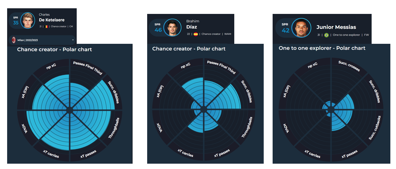 Ma poi diventa molto interessante andarsi a vedere una serie di metriche avanzate (per 90 minuti, non assolute) che propongo nella Pie Chart qui sotto, che sono le metriche principali per i centrocampisti offensivi.