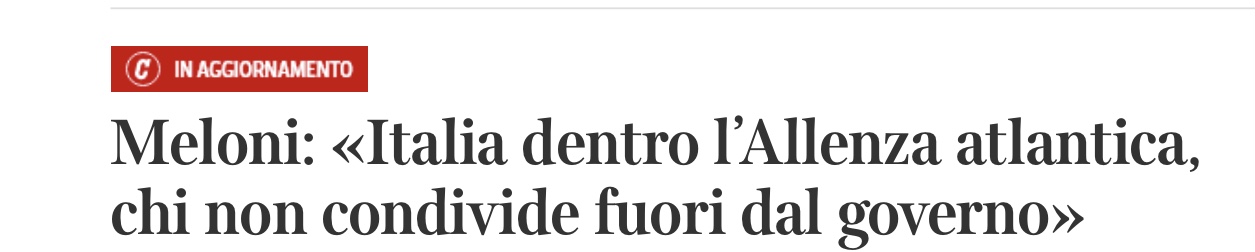Meloni: "Su una cosa sono stata, sono, e sarò sempre chiara. Intendo guidare un governo con una linea di politica estera chiara e inequivocabile. Chi non è d'accordo, esca subito dal governo. Anche a costo di non farlo."