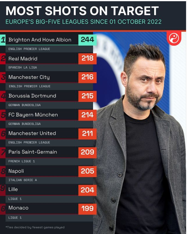 Come riporta il Sito di statiche e numeri - Squawka - la squadra che ha fatto più tiri in porta dal 1 ottobre 2022 (ovvero quando De Zerbi presi il Brighton) è il Brighton con un totale di 244. Dietro il Real con 218 ed il City Terzo con 216.