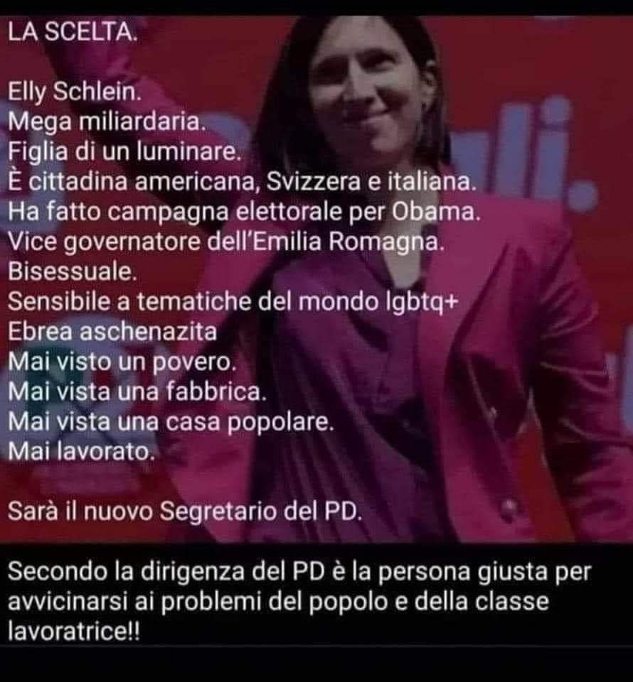 Poi se la critica è "ci potrebbe anche essere Gesù Cristo, ma per me sono una banda di ladri", allora alzo le mani, non stai commentando Schlein/Gesù stai facendo considerazioni generali che nulla hanno a che fare con la politica propagandata dalla Schlein stessa.
