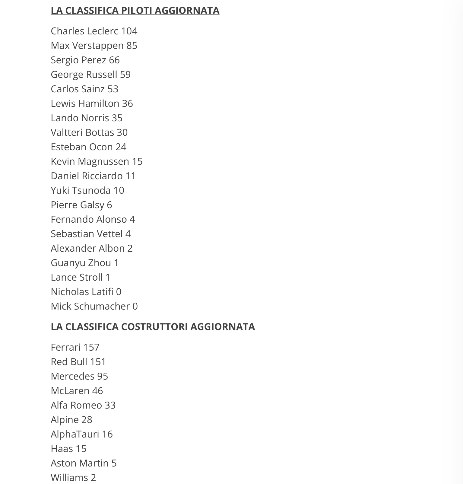 F1 2022 - Classifiche piloti e costruttori