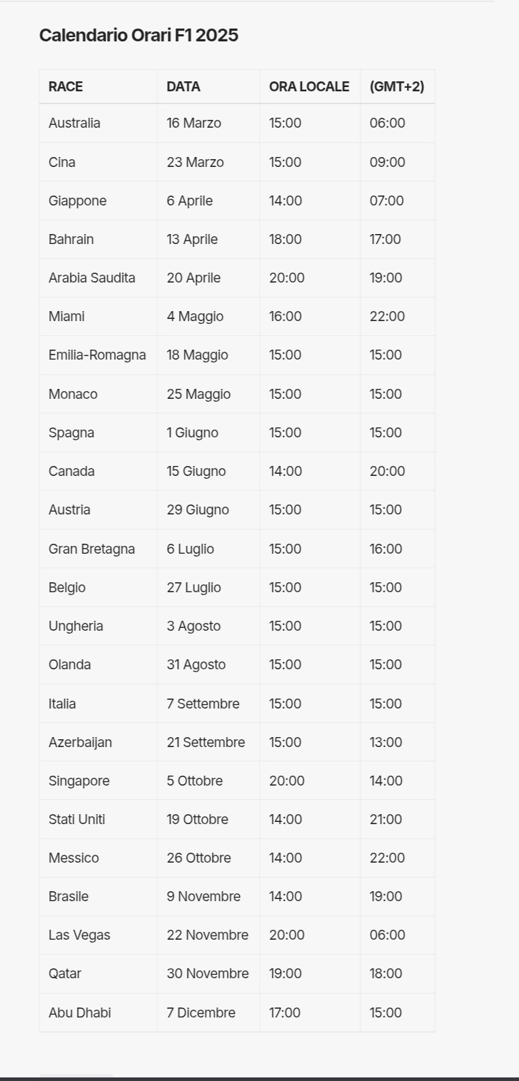 F1 2025 - Calendario Ufficiale