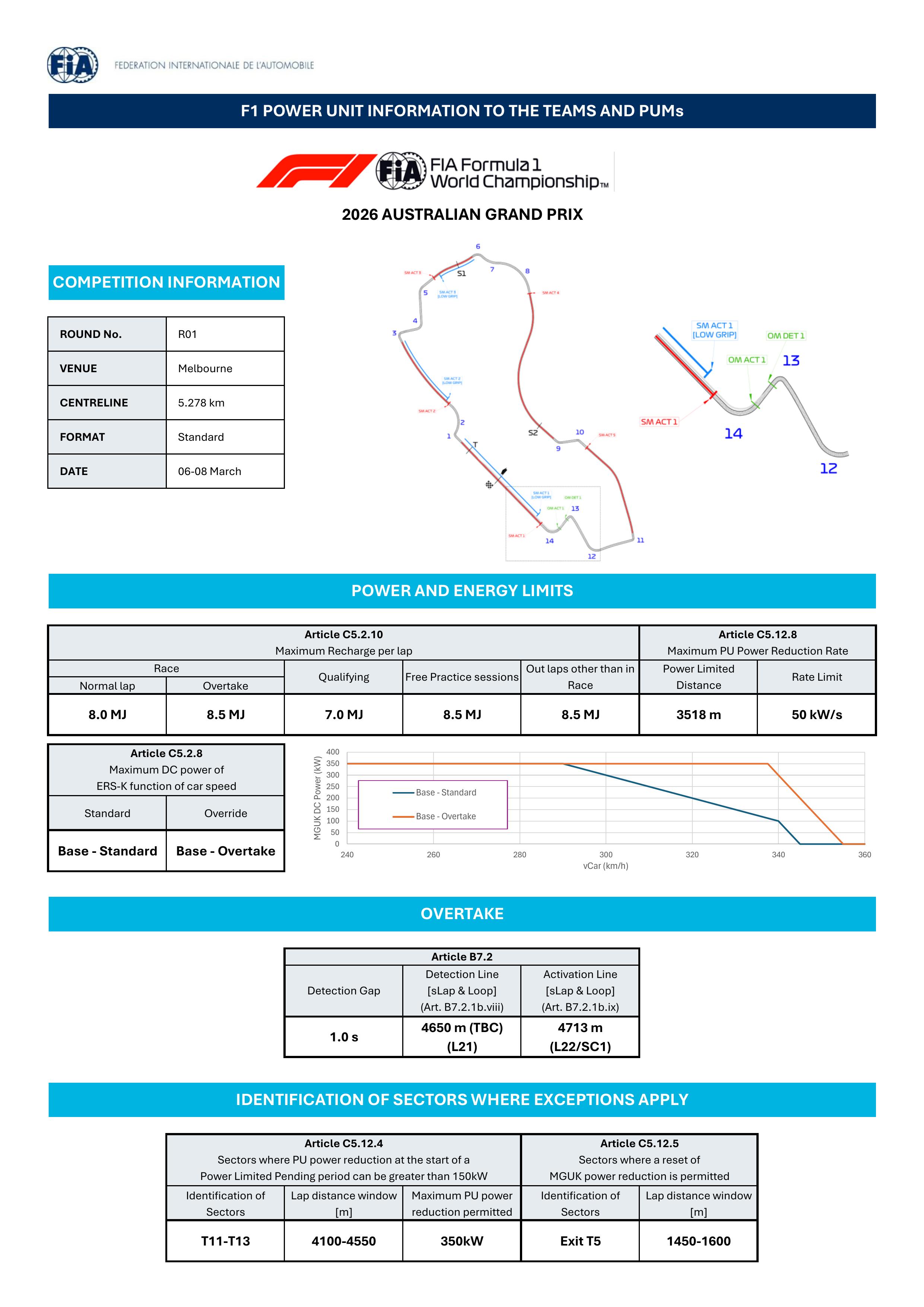 La FIA può abbassare a propria discrezione il recharge massimo per un totale di 8 gp. Lo farà già qui a Melbourne abbassando la ricarica per la sola qualifica a 7 Mj, rimaste invariate per le altre sessioni. Il grafico mostra come funziona la modalità sorpasso, 0.5 Mj a disposizione di chi segue a meno di un secondo la macchina davanti all'overtake detection (curva 13). Surplus che si attiva dopo i 290km/h mantenendo la potenza fino ai 330 (linea arancione), mentre il pilota davanti subirà un taglio progressivo fino a 340 e poi di nuovo per arrivare a pareggiare entrambi a 350. Per questione di sicurezza ci sono parti del tracciato dove non sarà possibile ricaricare o comunque solo di un tot. Kw, altri punti dove sarà permessa la ricarica massima, per evitare che due piloti si incrocino in pista con differenze di velocità troppo grandi.