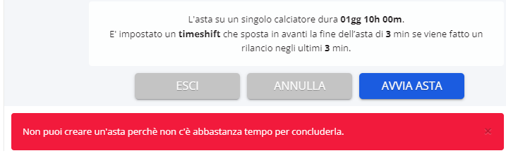 Le aste finiranno tutte domani nel primo pomeriggio. Avendo svincolato prima gli attuali in rosa contando di sostituirli, chi dovesse perdere alcune delle aste in gioco si ritroverebbe con la rosa incompleta a pochissimo tempo dall'inizio del turno di campionato, senza dunque poter schierare la formazione.
