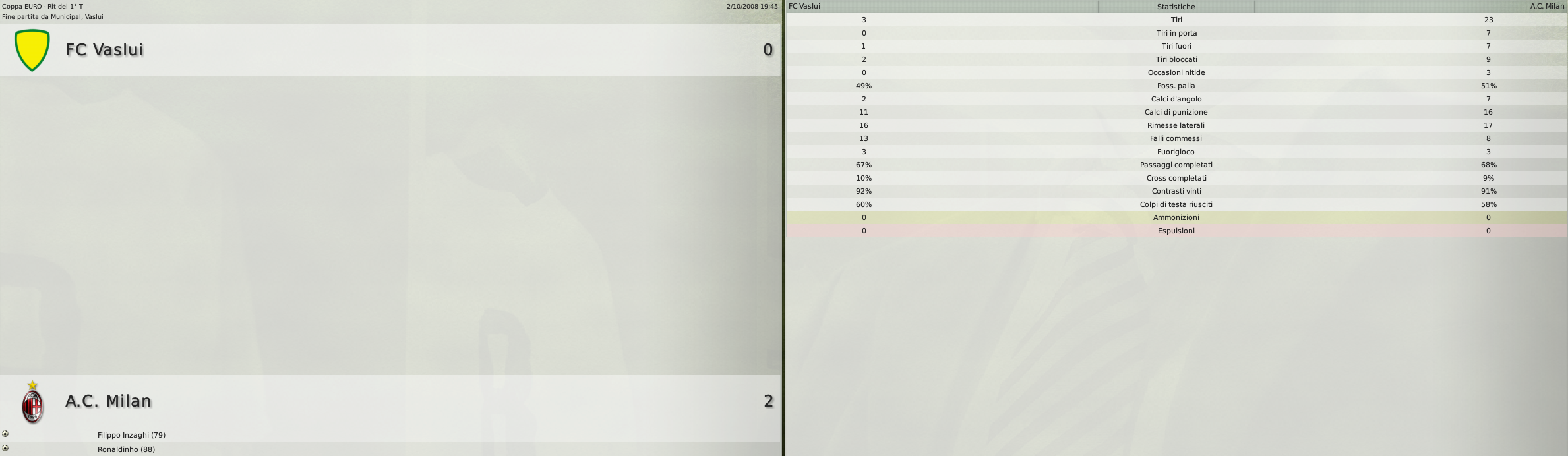 La partita con il Vaslui, come ampiamente prevedibile, ci vede dominatori e la portiamo a casa agevolmente con doppietta di un Ronaldiho sempre più ispirato (altra punizione bellissima!), nonostante l'ampio turnover.