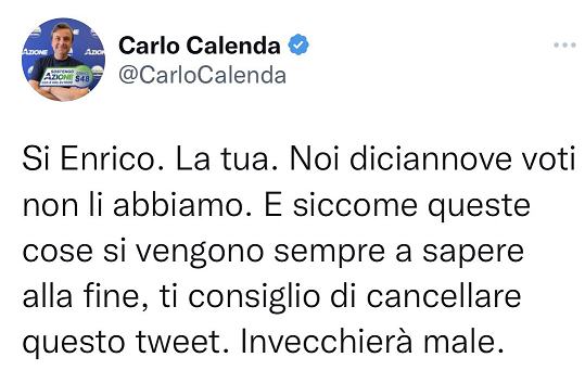 Qua comunque Renzi nelle ultime righe dice qualcosa che si prospetta ben più ampio, delle voci che vedrebbero lui e Calenda votare La Russa. Una buona parte di M5S-PD ha tradito.