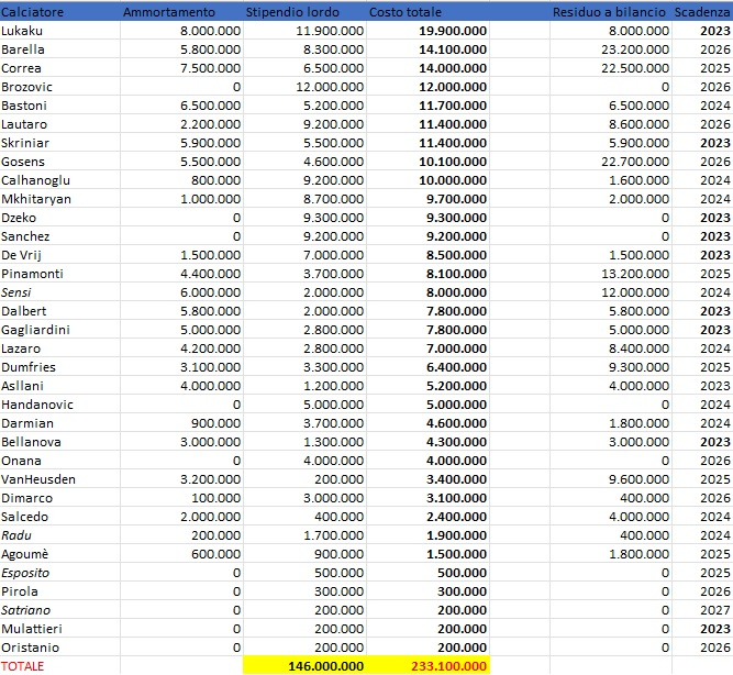 Noterete che diversi giocatori da cui gli sfinteristi fantasticavano decine di milioni sono partiti praticamente gratis (Satriano, Esposito, Radu, Sensi). Per convenzione si è considerato il classico 50/50 sugli stipendi.