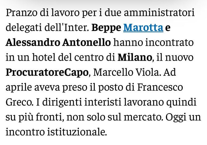 Faccio notare che il procuratore capo di Milano, ossia il capo dei pm che stanno indagando, è un tifoso interista sfegatato "vip" (alla Mentana, Cottarelli, etc..). Nel suo libro c'è un passaggio in cui si parla di come il suo ufficio sia tappezzato di maglie di calciatori interisti. Come se non bastasse, 2 anni fa uscì la notizia di un pranzo "istituzionale tra lui e Marotta.