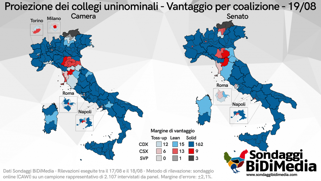 immaginate se ci fosse una legge elettorale come quasi tutto l'Occidente più che altro e non dei vecchiazzi costituzionalisti spaventati dal fantasma fascista che non vogliono il governo forteProiezioni del istituto sondaggistico Bidimedia sui collegi uninominali.. ed immaginatevi come sarebbe la situazione se la gente di destra votasse centrodestra e non i partitini sovranisti..