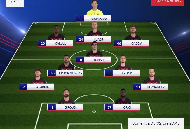 MIlan: Tatarusanu; Kalulu, Kjaer, Gabbia; Calabria, Messias, Tonali, Krunic, Hernandez; Giroud, Origi.