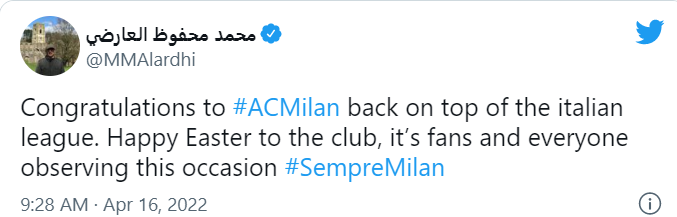 Mohammed Al-Ardh di Investcorp da i complimenti al Milan via social, dopo la vittoria di ieri:"Congratulazioni al Milan per essere tornato in vetta al campionato italiano. Buona Pasqua al club, ai suoi tifosi e a tutti quelli che festeggiano in quest'occasione".