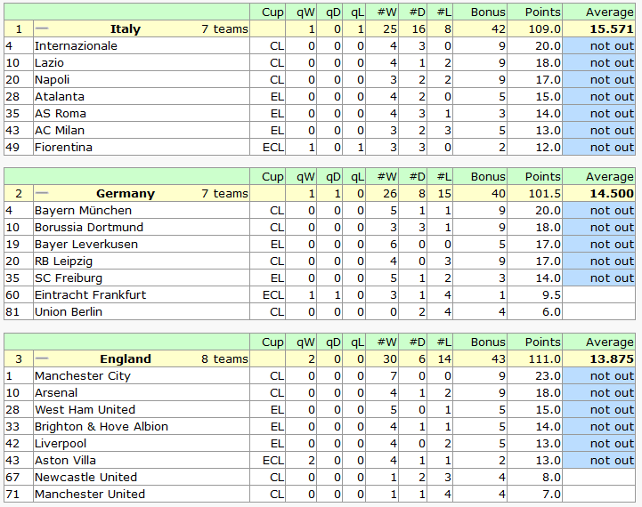 Le squadre italiane quest'anno fanno registrare un ottimo rendimento con 25 vittorie, 16 pareggi e 8 sconfitte.