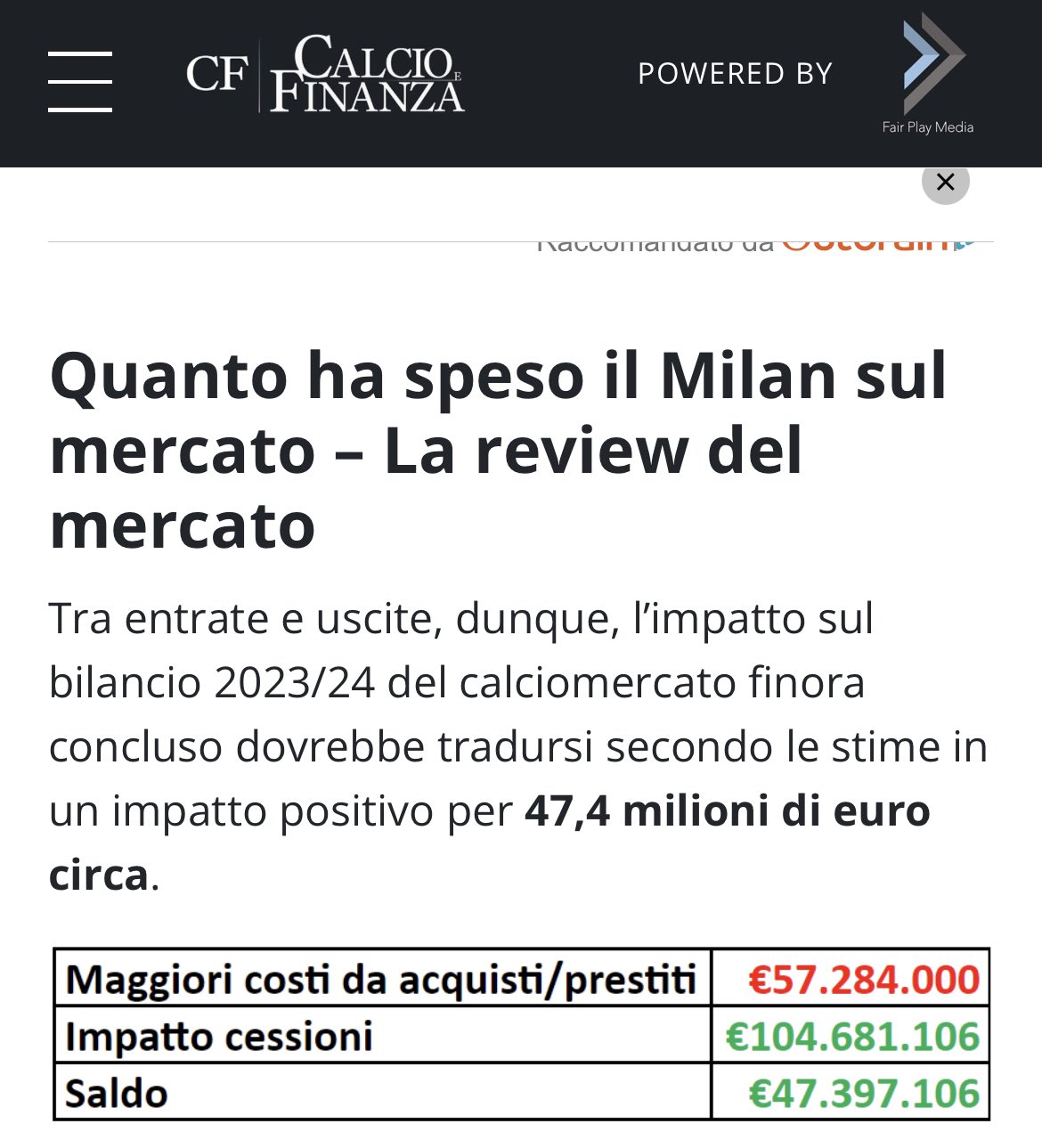 Calcio e Finanza fa i conti del mercato estivo del Milan, ad oggi. Registrato un risparmio complessivo di quasi 50 mln