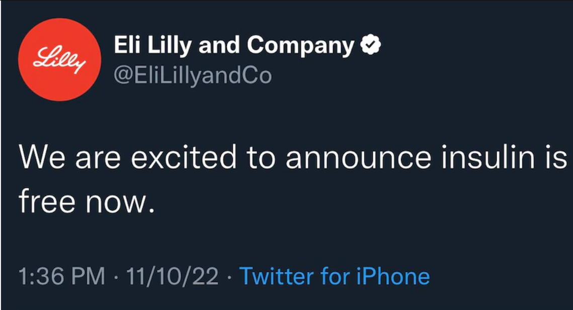 Quello che mi aspettavo è accaduto, qualcuno ha creato un falso profilo della casa farmaceutica eli lilly (pagando 8 dollari per la spunta blu) e ha fatto un tweet dicendo che l'insulina sarebbe stata gratis, risultato? Hanno perso in borsa il 4.5%