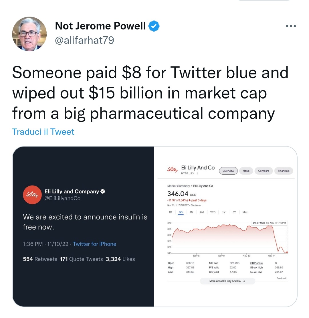 Si ma converrai con me che se negli sbagli fai perdere milionii di dollari ad un'azienda a qualcuno potrebbero girare non poco i coions (il crollo è arrivato in concomitanza con il tweet, non penso li avrebbero persi altrimenti)