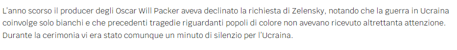 Più curiosa la motivazione utilizzata 12 mesi fa per rifiutare l'intervento agli oscar del *********** ucraino (che poi magari è la stessa motivazione anche per il rifiuto di quest'anno :asd: )