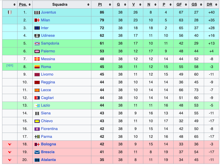 Off topic: quel "hanno rischiato la B" mi ha incuriosito. Guarda la classifica di quell'anno: praticamente tra il 7° posto (zona Europa League) ed il 18° c'erano a 6 punti. Classifica cortissima, altro che lo schifo di oggi.