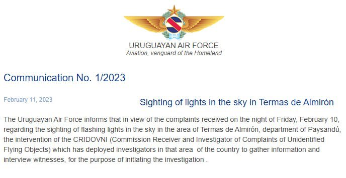 Aggiungo che l'aeronautica militare dell'Uruguay ha aperto qualche ora fa un'indagine su "avvistamento di luci lampeggianti nel cielo sopra Termas de Almíron". Qualsiasi cosa significhi, la situazione è veramente bizzarra ??