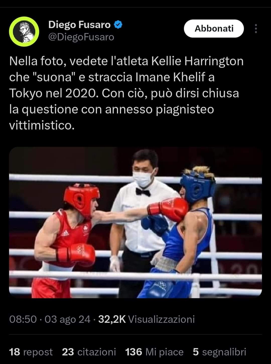 Lasciando perdere l'atteggiamento dell'italiana (di cui non ho un giudizio netto, ma nella diretta ho notato comunque una superiorità netta del suo avversario), ho fatto notare nel topic dedicato che all'epoca l'algerina con i cromosomi da maschio lottava in un'altra categoria, i pesi leggeri, infatti lui aveva un fisico diverso e per di più perse contro quella che poi divenne medaglia d'oro.