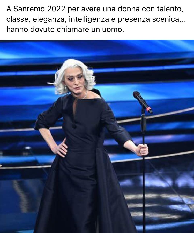 Addirittura presentare Sanremo con valletti maschi, i gay e trans che lo rivendicano come se fosse loro! La fiera dell'assurdo! E' fondamentalmente un LEGNANESE che se la mena.